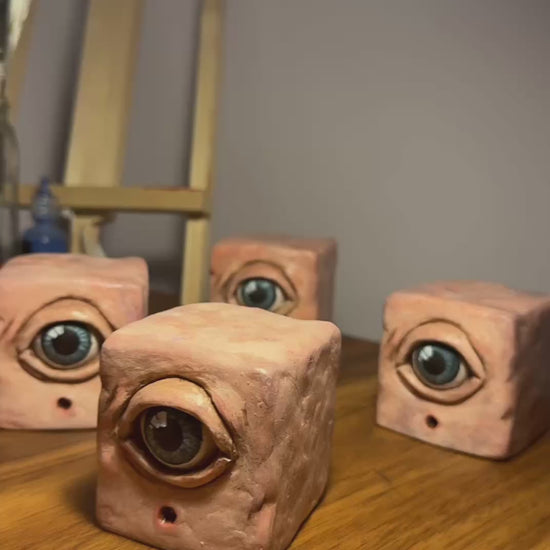 Hand-cast resin “Watching Block” — a tiny creature that always watches.